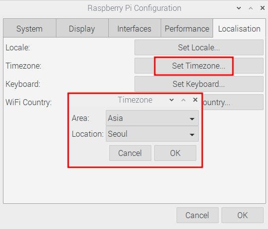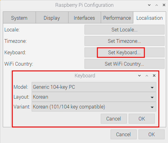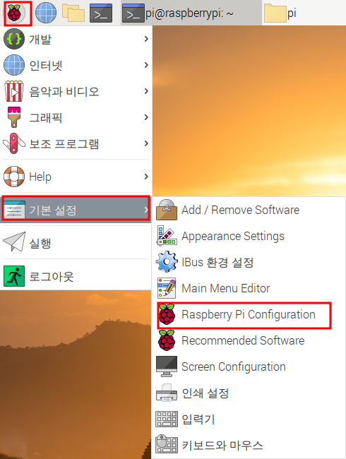 메뉴 > 기본 설정 > Raspberry Pi Configuration 을 선택합니다.