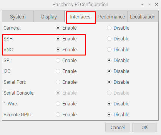 SSH와 VNC를 사용하기 위해 RaspberryPi Configuration 에서 아래와 같이 두 항목을 Enable 체크를 합니다.