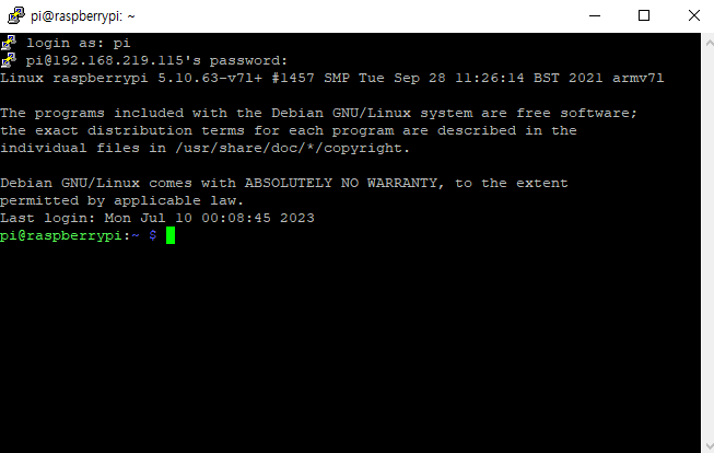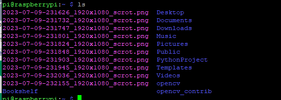 지금부터는 라즈베리파이에 터미널로 접속한 것이고, 명령어를 통해 제어를 할 수 있습니다. ls 를 쳐 보니까 현재 폴더에 있는 내용이 검색이 됩니다.