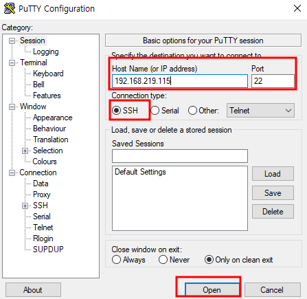 PuTTY를 실행하면 아래와 같은 창이 뜨는데, 아까 확인했던 ip를 입력합니다. port 번호는 22번으로 세팅하시면 되고 SSH로 세팅이 되어 있어야 합니다.