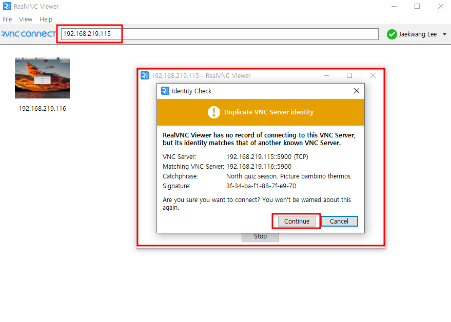 위의 칸에 ip 주소를 적어 줍니다. 그리고 enter를 누르시면 아래와 같이 identity check 다이얼로그가 뜨고 continue를 눌러 줍니다.