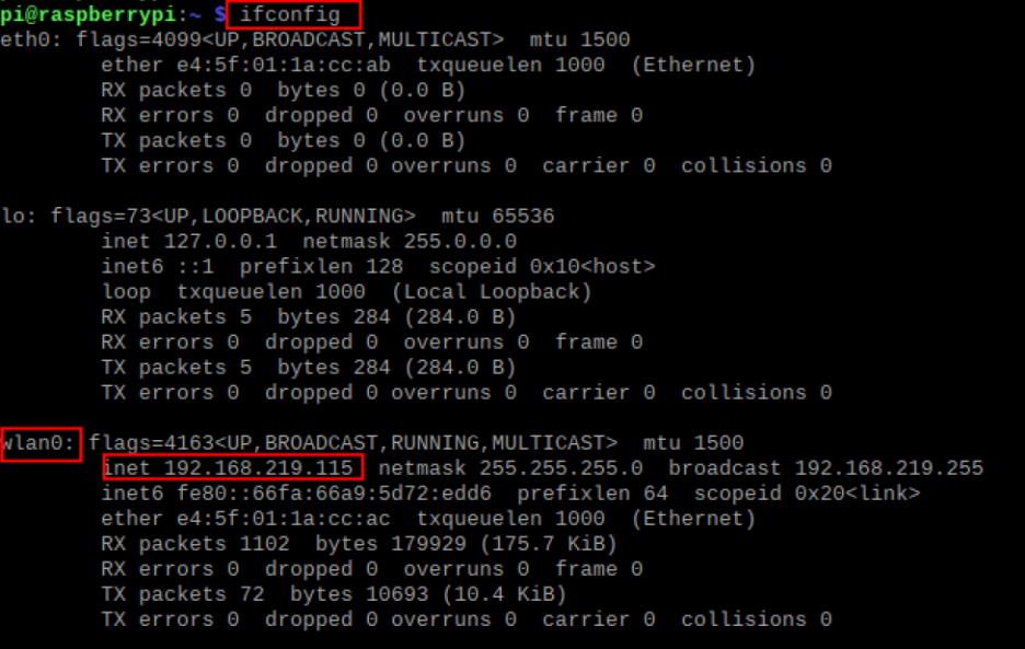 터미널을 여시고 $ifconfig 를 치시면 아래와 같이 ip 주소를 알아내실 수 있습니다. wlan0 설정 값의 inet 을 잘 기억해두시기 바랍니다. 나중에 SSH, VNC Viewer 를 이용하여 PC에서 라즈베리파이에 네트워크로 접속할 때 필요합니다. 물론 라즈베리파이를 재부팅하면 ip가 바뀔 수 있습니다.