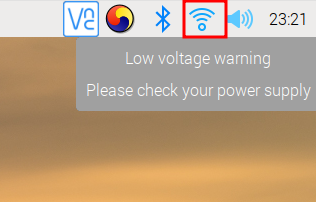 Wifi는 우상단에 있는 wifi 버튼을 누르신 후 설정이 가능합니다. 전 지금 5V 2A 짜리 아답터에 연결을 해 놔서 그런지 Low Voltage warning 이 뜹니다. 꼭 3A 이상을 사용하시기 바랍니다.