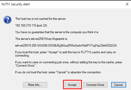 위의 칸에 ip 주소를 적어 줍니다. 그리고 enter를 누르시면 아래와 같이 identity check 다이얼로그가 뜨고 continue를 눌러 줍니다.