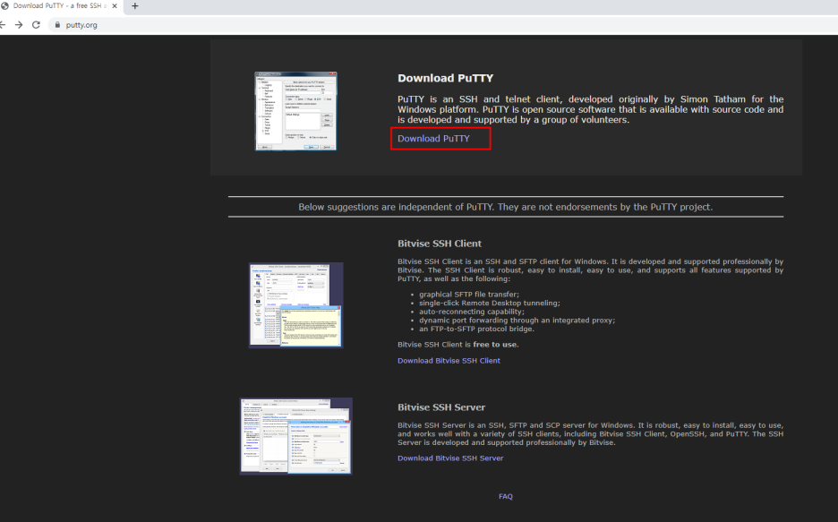 위 사이트에 접속을 하시면 아래와 같은 화면이 뜹니다. Download PuTTY를 클릭합니다.