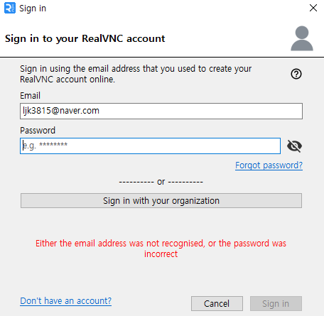RealVNC를 사용하기 위해서는 회원가입이 필요합니다. 무료이니 회원 가입 하시고 아래와 같이 로그인을 하시면