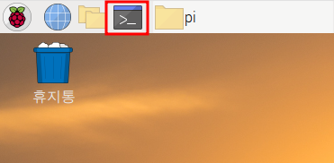 라즈베리파이 OS의 작업 표시줄의 검은색 모양의 아이콘이 터미널 프로그램을 실행시킬 수 있는 아이콘입니다. 이 아이콘을 누르시면 터미널이 나오는데, 터미널로 리눅스 명령어를 사용하실 수 있습니다.