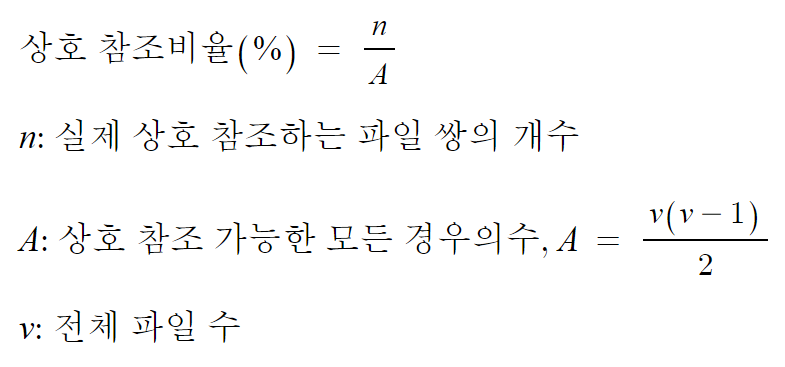 상호 참조하는 파일 쌍의 개수(n): 1개 (B ↔ C) 파일 수(v) = 5 가능한 상호 참조 경우의 수 A = v(v-1)/2 = 10