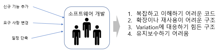 자꾸 신규 기능이 추가되거나 요구사항이 변경되거나 일정 단축 등의 이유로 코드의 품질, 설계에 신경을 쓰지 못하고 당면한 이슈 해결을 빨리 수정하는 방법으로만 처리 하다 보니까 품질이 나빠집니다.
