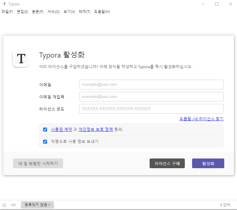 그래도 한번 다운 받아보시면, 아래와 같이 15일짜리 체험판 또는 라이선스 구매를 해서 활성화 하라고 나와요.