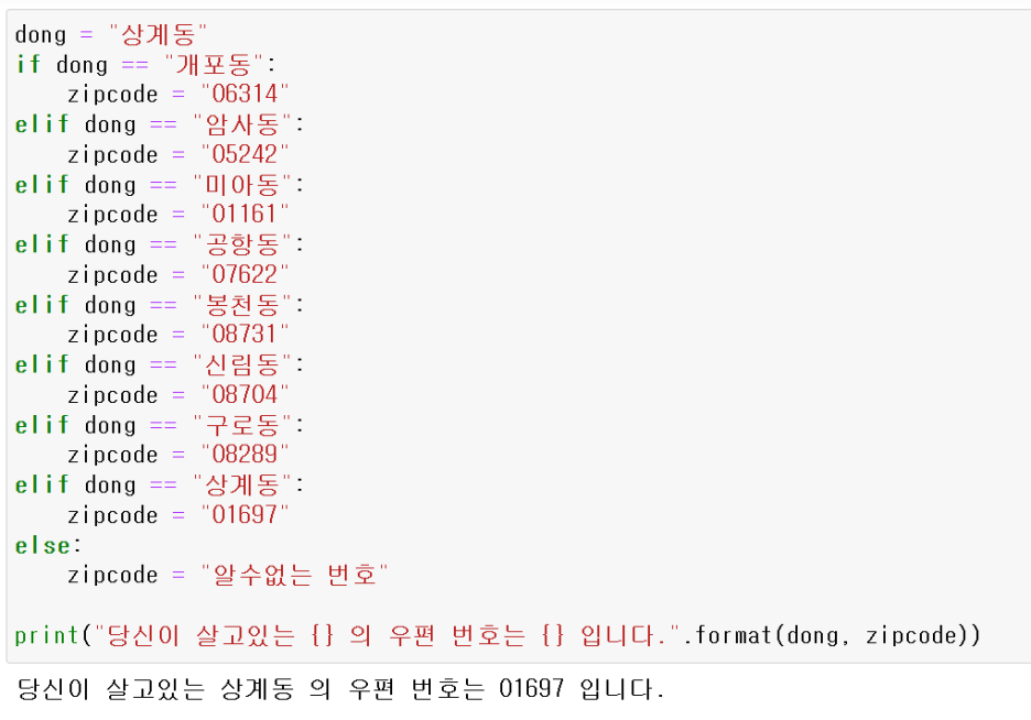 한가지 예를 들어보겠습니다. 동 명을 입력하면 우편번호를 알아내는 코드를 만들어 보겠습니다. 상계동의 우편번호를 알아내는 코드 입니다. (물론 상계동에도 ~길이 있고, ~로가 있는데, 그 중 한개를 알아내서 적어 온 것 입니다.)