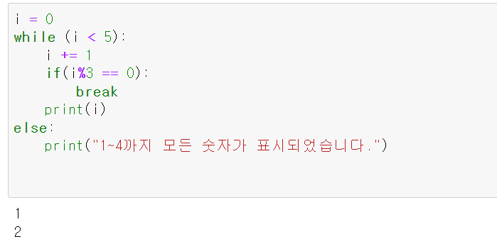 while-else 문도 for 문과 마찬가지로 동작합니다. while 문에 break 될 경우에는 else 블록이 실행되지 않습니다.