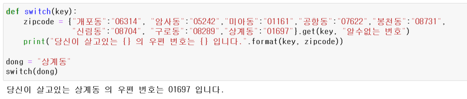 아직 함수에 대해 언급하지 않았지만 일단 이렇게 구현할 수 있다는 것 정도만 알아두시면 됩니다. .get() 메소드는 key에 맞는 value 값을 반환해주고, 만약 key 를 못찾았다면 그 다음 인자인 "알수없는 번호"를 반환하는 메소드 입니다. else와 같죠.