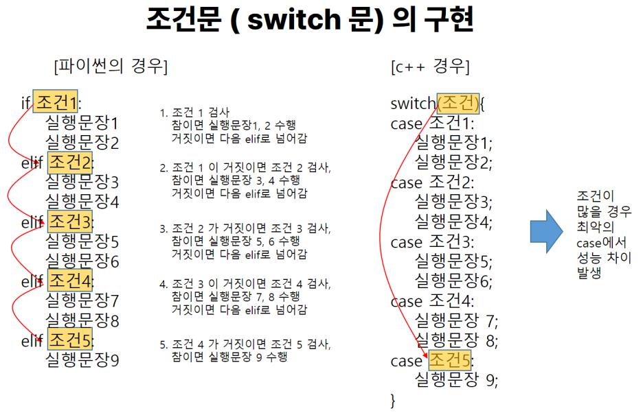 조건문을 사용하다보면 의문이 생깁니다. if-elif~else 문을 사용하다보면 조건이 많을 때가 있습니다. if~elif~else 문은 처음부터 조건을 모두 검사하면서 순차적으로 진행하므로 최악의 case에는 모든 조건을 다 검사해야 할 수 있습니다. 하지만 다른 언어에서는 switch 문이 있어서 바로 jump를 할 수 있어 성능 측면에서 좋을 수 있습니다. (참고로 C++의 switch 문에서 break;를 써줘야 다음 case로 fall through를 안하는데, 아래 예시는 너무 길어져서 생략한 것 입니다.)