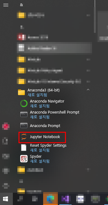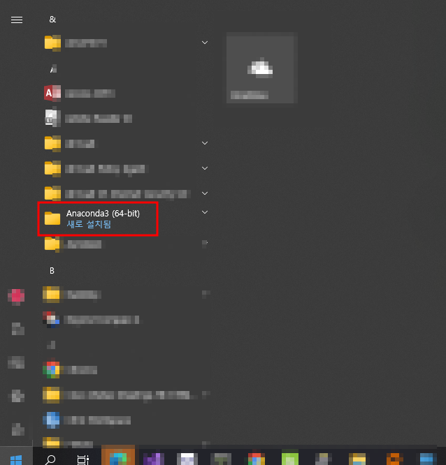 왼쪽 하단 윈도우 표시를 클릭해보면 아래와 같이 Anaconda3 가 새로 설치되었다고 보입니다.