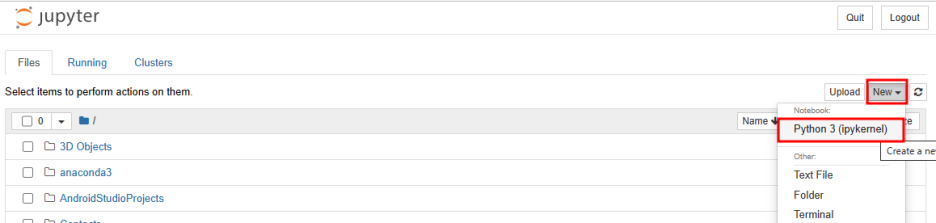 오른쪽 상단의 New 버튼을 누르시고 Python 3(ipykernel)을 누르시면