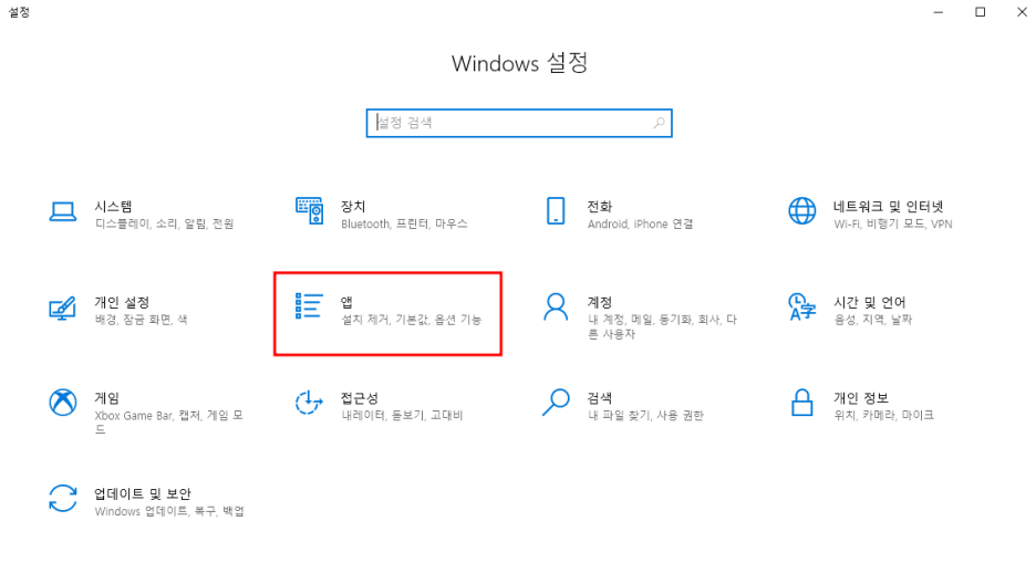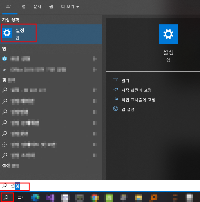 윈도우 옆에 돋보기를 클릭하셔서 '설정'을 검색하시면