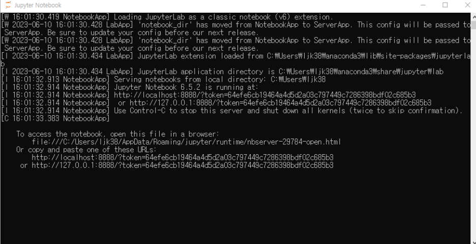 아래와 같이 검은색 프롬프트 창이 뜨면서 아래와 같은 Jupyter notebook 창이 뜨는데, 프롬프트 창은 닫으시면 안됩니다. 그리고 Jupyter notebook은 크롬 브라우저에 최적화 되어 있어 크롬으로 실행시키도록 해야 합니다.