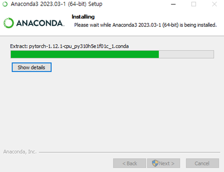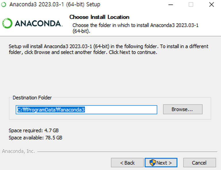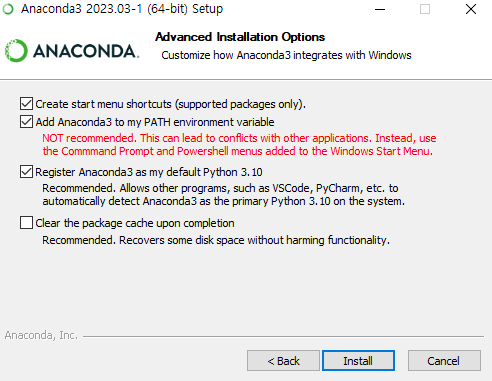 Register Anaconda3 as the system Python 3.10... 체크 박스는 기본으로 체크가 되어 있는데, 여기에 체크를 하면 Anaconda를 기본 Python으로 등록하게 됩니다. 그리고 Anaconda 또는 파이썬 등이 깔려있지 않은 PC라면 Add Anaconda3 to my PATH... 를 클릭하셔도 됩니다. 하지만 not recommended 이네요.