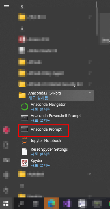 새로 설치된 Anaconda3를 확장시켜보면, 아래와 같이 Anaconda Prompt가 있습니다.