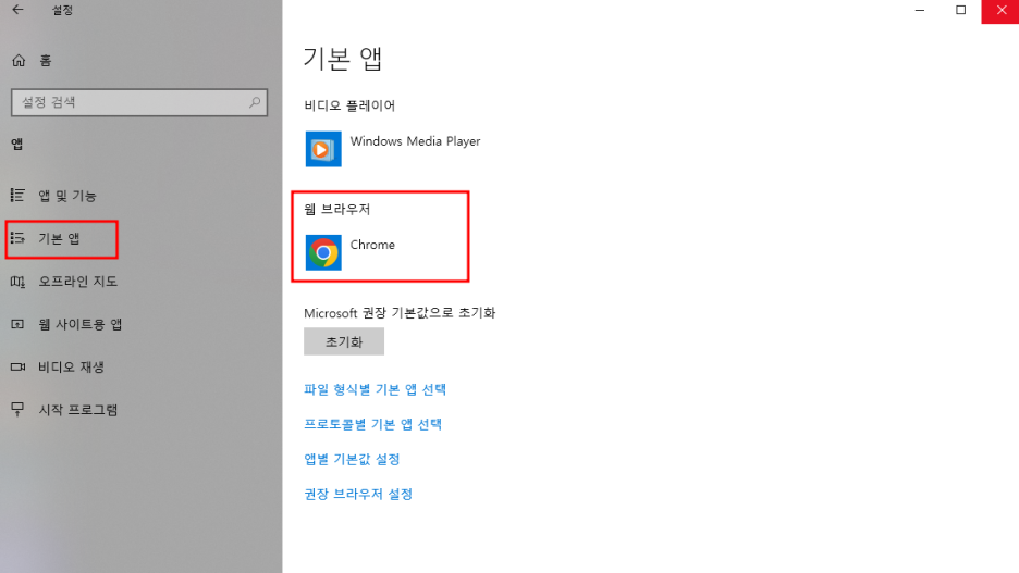 앱을 클릭하시면 왼쪽에 '기본 앱' 이 있습니다. 기본 앱을 클릭하시면 웹 브라우저가 있는데, 웹 브라우저를 클릭하셔서 chrome을 설정해 주시면 기본 앱으로 크롬이 실행됩니다.