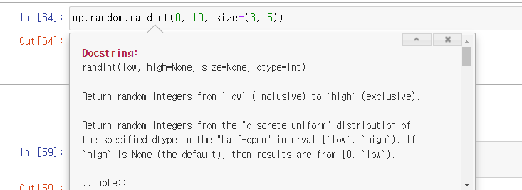 randint(low, high-None, size-None, dtype=int) 라고 되어 있습니다.