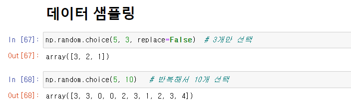 데이터에서 일부를 무작위로 선택하는 것을 표본선택, 또는 샘플링이라고 합니다. 샘플링에는 choice 라는 메소드를 사용합니다.