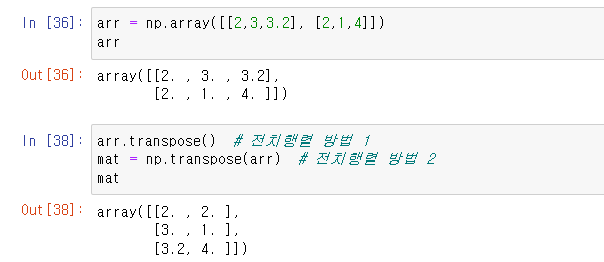 예를 들어 2x3 행렬을 만든 다음에 전치행렬을 만들어 보려면 아래와 같이 하면 됩니다. (두가지 방법 모두 가능합니다.)