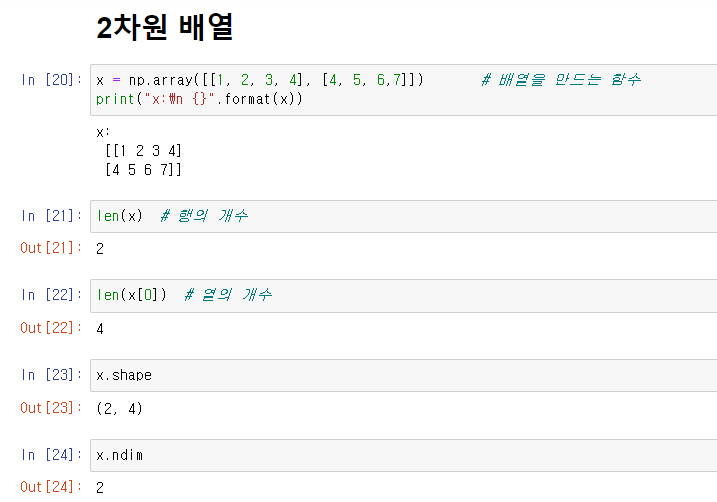 넘파이의 array 함수에 리스트를 넣으면 ndarray 클래스 객체, 즉 배열로 변환해 줍니다.