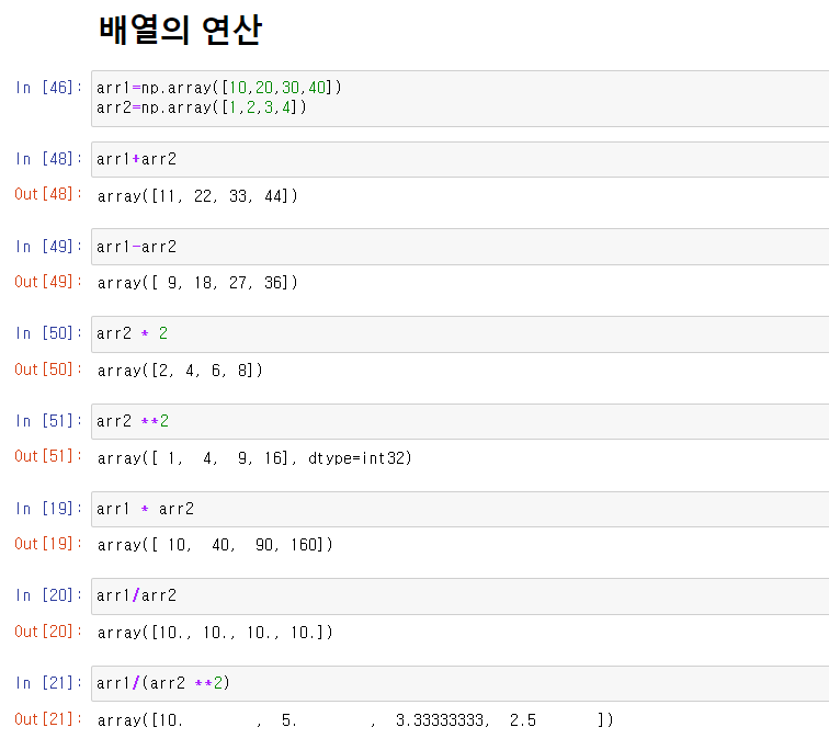 아래 원소에 각각 2배씩하는 경우 list인 경우 for문을 이용하여 아래와 같이 계산을 해야 하는데, numpy 배열의 경우 바로 객체에 바로 2를 곱하면 됩니다.