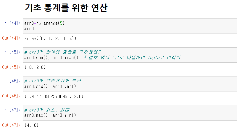 Numpy에서 아래와 같이 기초 통계를 위한 연산이 가능합니다.