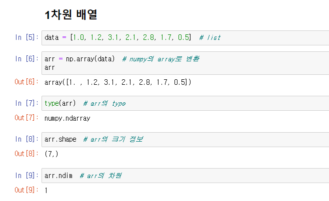 list를 만들고 np.array()에 list를 넣으면 type이 numpy.ndarray 형이라는 것을 보여줍니다. 리스트와 numpy의 배열과 다른 점은 C언어의 배열처럼 연속적인 메모리 배치를 가지기 때문에 모든 원소가 같은 자료형이어야 합니다. 대신 원소 접근과 반복문 실행이 빠릅니다.