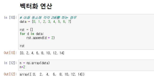 아래 원소에 각각 2배씩하는 경우 list인 경우 for문을 이용하여 아래와 같이 계산을 해야 하는데, numpy 배열의 경우 바로 객체에 바로 2를 곱하면 됩니다.