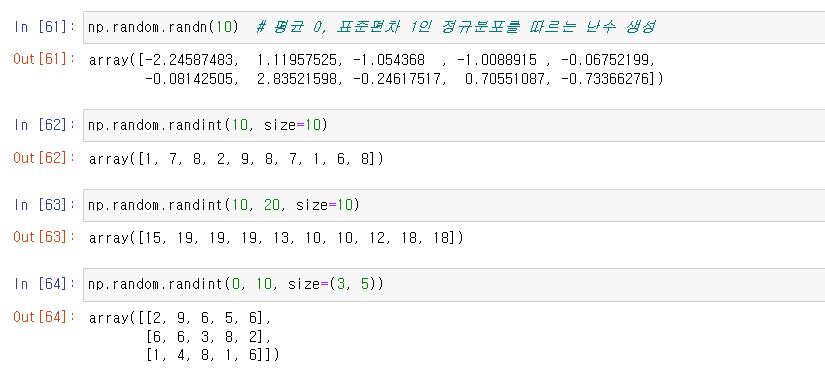 - randn: 표준 정규 분포에 맞는 난수 생성