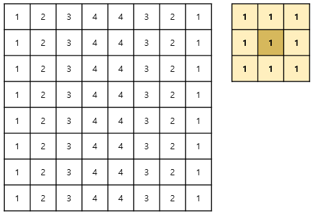 아래와 같은 영상이 있고 커널 값이 모두 1인 window가 있다고 한다면,