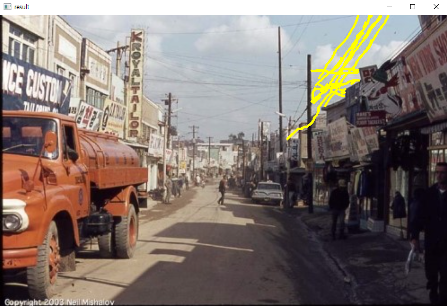 마우스를 result 윈도우에 올리고 왼쪽 버튼을 누르면서 마우스를 움직이면 영상이 훼손되기 시작합니다.
