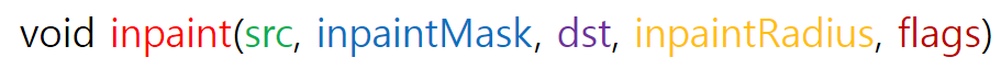 영상에 흠집이 생기거나 원하지 않는 부분 영역을 삭제하고 주변 화소값을 이용해서 채워 넣고 싶을 때 사용하면 됩니다.