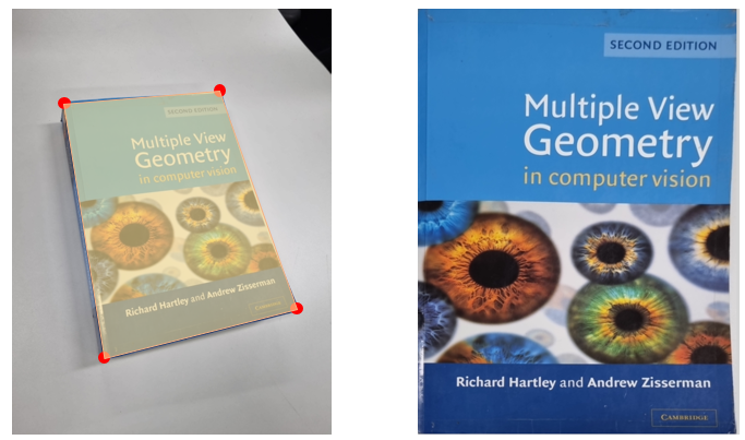 아래와 같이 대충 찍은 문서의 4 끝점 좌표를 입력하고, 원하는 사이즈의 영상의 크기의 직사각형으로 변환하는 행렬을 계산하면 오른쪽과 같은 영상을 얻을 수 있습니다.