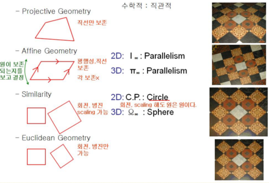 Euclidean Space, Similarity Space, Affine Space, Projective Space 입니다.