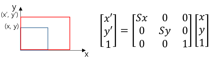 x 방향으로 Sx만큼, y 방향으로 Sy 만큼 크기를 변환하는 행렬은 아래와 같습니다.