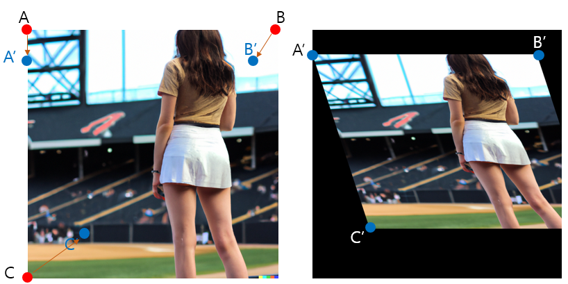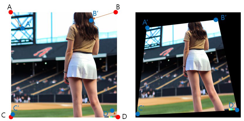 형태는 getAffineTransform()과 같으므로 설명은 생략하고, srcPt[], dstPt[] 에 각 4점의 좌표씩 들어가 있어야 하며, 각 순서는 쌍으로 대응이 됩니다.