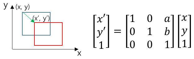 x 축 또는 y 축 방향으로 영상이 밀리는 것처럼 보이는 변환이며, 아래와 같습니다.