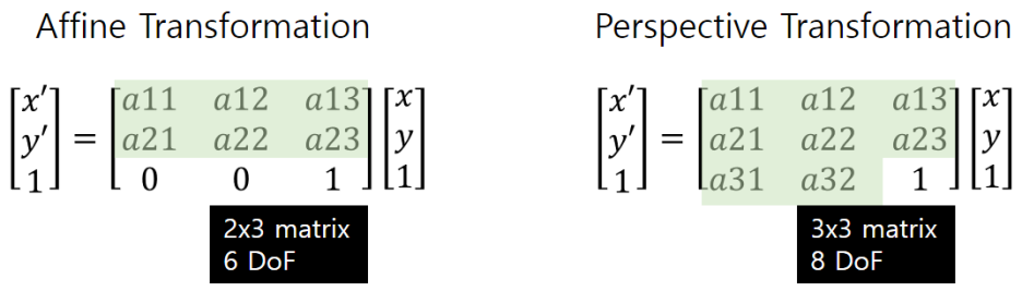 우리는 영상에서 다른 영상으로의 변환이기 때문에 3x3 행렬 내에서 모든 변환이 가능합니다.