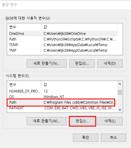 환경변수에서 시스템변수의 Path를 선택 후 편집을 누르면,