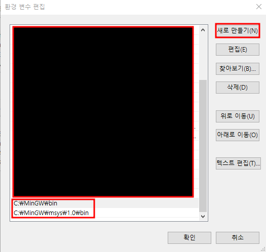 환경 변수 편집할 수 있는 창이 뜨고 새로 만들기를 하여, MinGW를 설치한 위치\bin,