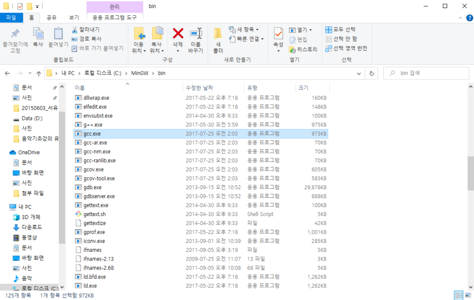MinGW 설치 폴더의 bin 폴더로 이동하게 되면, 아래와 같이 g++.exe, gcc.exe가 설치된 것을 볼 수 있습니다.