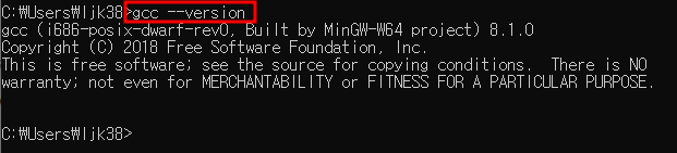 아래와 같이 검정색 창이 떠요. 여기에서 gcc --version 을 입력하면 아래와 같이 버전 정보가 나옵니다.
