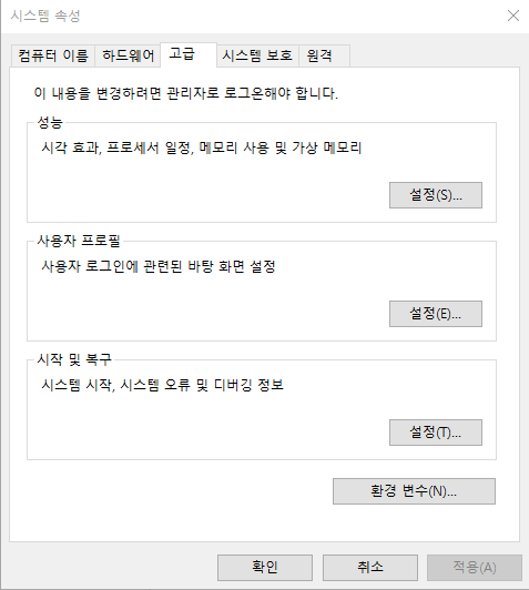 시스템 속성에서 환경변수 버튼을 클릭하신 후