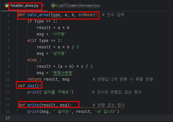 일단 위에서 작성한 면적 구하는 함수들을 별도의 파일로 저장을 합니다. 저는 header_area.py로 저장하였습니다.